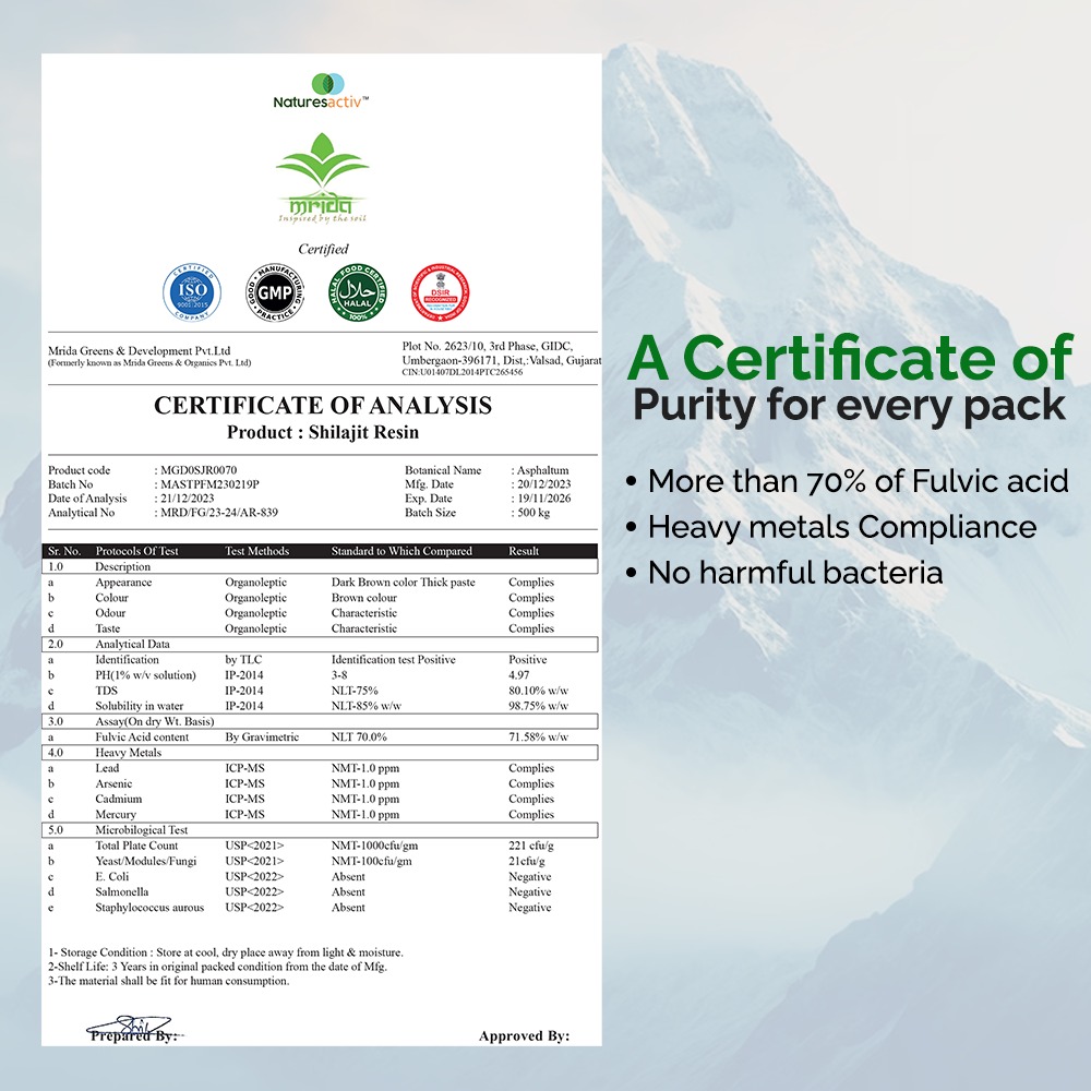 Look for Shilajit that is lab-tested for purity and free from contaminants. Preferably from a Third party lab tested Shilajit, which authenticates Fulvic acid percentages along with Heavy metal analysis.